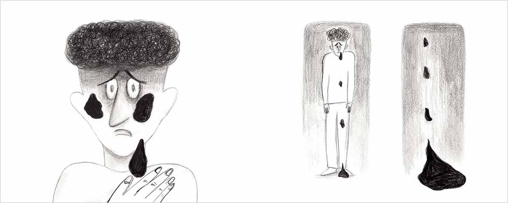 『누군가 뱉은』은 콩테로 그리고 칠한 작품이다. 콩테는 칠하면 칠할수록 짙어지며 어두워진다. 감정이 켜켜이 쌓이는 것처럼 말이다. 또 콩테는 예리하게 그리면 날카롭게, 번지게 그리면 우울하게 느껴지게도 한다. 『누군가 뱉은』은 매 페이지마다 콩테의 이러한 특성을 살려 ‘꺼져’의 감정을 생생하게 그려 냈다. 그리고 앞쪽 흑백의 콩테 그림들은 뒤쪽에 나오는 무지갯빛 방울들을 돋보이게 해 주는 역할도 한다. ‘꺼져’가 흑백 세상에서 살다가 만난 아름다운 무지갯빛의 세상을 독자 역시 공감할 수 있다. 작가의 이런 의도를 생각하면서 글과 그림을 보는 것도 『누군가 뱉은』을 읽는 재미 요소 중 하나이다.