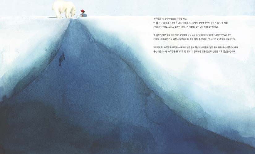 책을 펼치면 독자는 혹독한 바람이 부는 북극에 서 있게 됩니다. 그리고 그 환경에서도 체온을 유지해주는 두터운 털을 갖게 되지요. 얼음 위에서도 미끄러지지 않는 커다란 발과 일곱 살 어린이 두 명의 키를 합한 것과 같은 커다란 몸집도 생깁니다. 게다가 몇 킬로미터 밖에서도 물범 냄새를 맡을 수 있는 뛰어난 후각까지 장착하게 되면 정말 북극곰이 된 듯합니다. 독자는 북극곰이 되어 거센 바람과 세찬 눈보라를 맞으며 드넓은 얼음 바다로 사냥을 떠납니다. 바다에서 헤엄도 치고, 짝짓기도 하고, 새끼도 낳고 기릅니다. 읽는 이가 북극곰의 삶에 깊이 빠져들었을 때쯤 북극곰은 지친 몸을 회복하기 위해 잠이 듭니다. 사람처럼 아늑한 곳에서 웅크리고 잠이 드는 북극곰과 꼬마 주인공의 모습이 그려진 책의 마지막 장에 다다르게 되면 그제야 꿈에서 깨어나 듯 북극곰의 삶에서 빠져나오게 됩니다. 그리고 우리는 꿋꿋하게 살아가는 우리의 삶처럼 북극곰의 삶도 다르지 않다는 걸 느낄 수 있습니다.