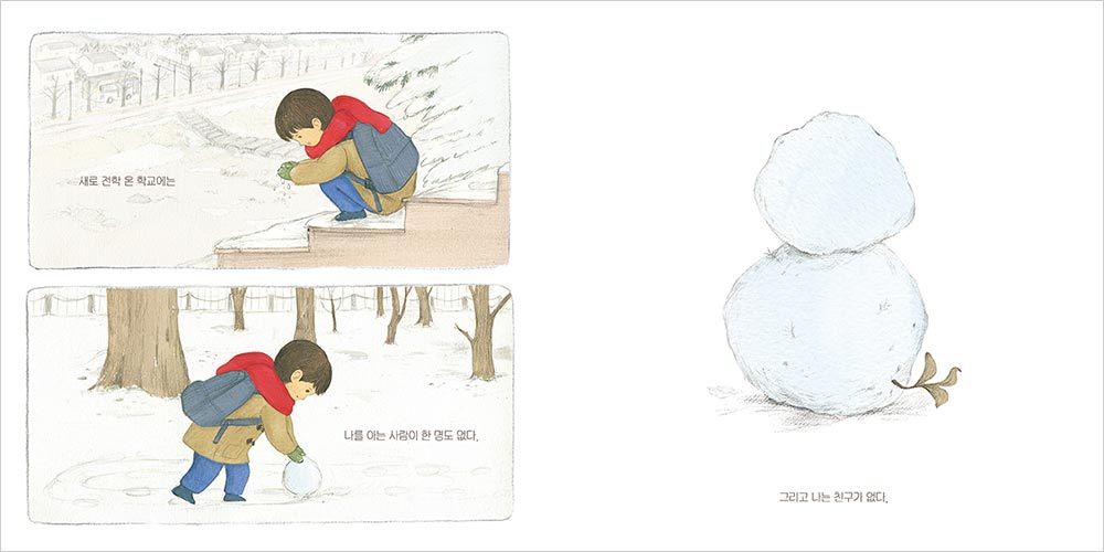 This story portrays the lonely daily life of a child who has firmly closed their heart, unable to adjust to a new school. The fear of being an outsider who doesn't know how to reach out is delicately illustrated through the setting of "not being able to hear." However, as a snowman the child mindlessly built on the way to school begins to change through someone else's touch, the child discovers the constant, tender "love" that has been knocking on their door all along. Through the wondrous moment when the walls of strangeness crumble and two worlds finally connect, this picture book beautifully conveys the meaning of relationships, courage, and love.