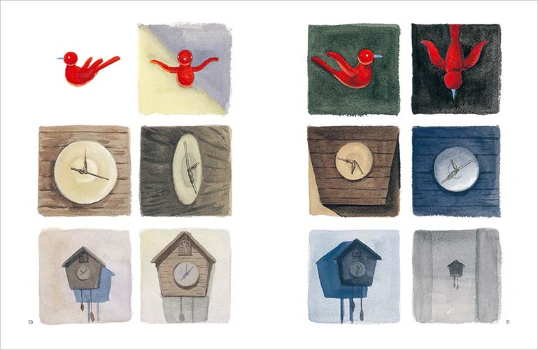 작가는 아무것도 하지 않고 아무 감정도 느끼지 못한 채 살아가는 삶과 수없는 희노애락의 부침을 소화해 자신을 성장시키는 삶 중 어느 것을 선택할 것인지 우리에게 물어봅니다. 슬픔의 구렁텅이에 빠지기도 하고 고통의 늪에 발이 묶이기도 하고 온전한 기쁨을 맛보기도 하면서 감정과 감정의 골을 우직하게 걸어가는 것이 영원의 시간임을 알려 줍니다. 비로소 이것을 깨달았을 때 매 순간 움직이면서도 늘 죽은 채였던 뻐꾸기시계의 시간은 쏟아지는 빛 속에서 자유를 맛보는 루아의 시간으로 변합니다. 한 번도 살아 있은 적이 없었던 뻐꾸기시계가 눈부신 체리빛 새로 변해 날아오릅니다.