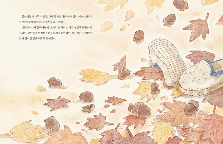 너와 첫 이별을 하던 날. 하굣길에 쉬이 발이 떨어지지 않던 그날. 난 집에 가기 싫은 마음에 혼자 빈 공원을 서성이고만 있었어. 빨리 돌아가야 한다는 걸 알면서도, 모른 척 괜스레 땅에 떨어진 도토리들만 주웠다 놨다….