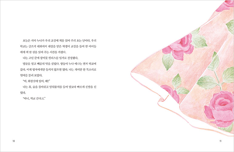 찢어졌던 부분에는 예쁜 자수까지 놓여 감쪽같았다. 나는 장미꽃 무늬 원피스를 가슴에 꼭 안았다.