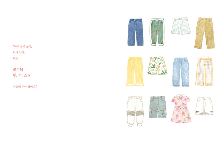 “바지 입기 싫어. 너나 입어. 나는 꽃무늬 원, 피, 스가 마음에 든단 말이야.”