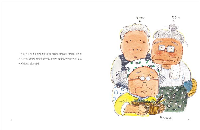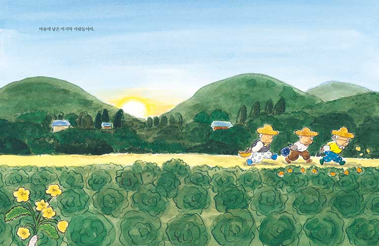그동안 세 할머니는 모두가 도시로 떠난 마을에 덩그러니 남아 쓸쓸한 몸 구석구석 쓸어내리며 살아왔지요. 그런데 이제는 그곳에서 보낼 여생의 의미가 새롭게 생겼습니다. 녀석들 때문에 어질러진 꼴을 보면 화가 나다가도, 뒤돌아서면 엉덩방아 찧을 만큼 껄껄 웃게 됩니다. 그렇게 자식도 이웃도 떠난 자리에 어느새 녀석들의 존재감이 떡하니 자리 잡았습니다. 할머니들은 이 녀석들을 지켜 주고 싶습니다.