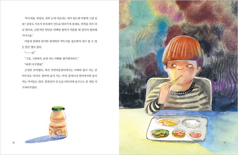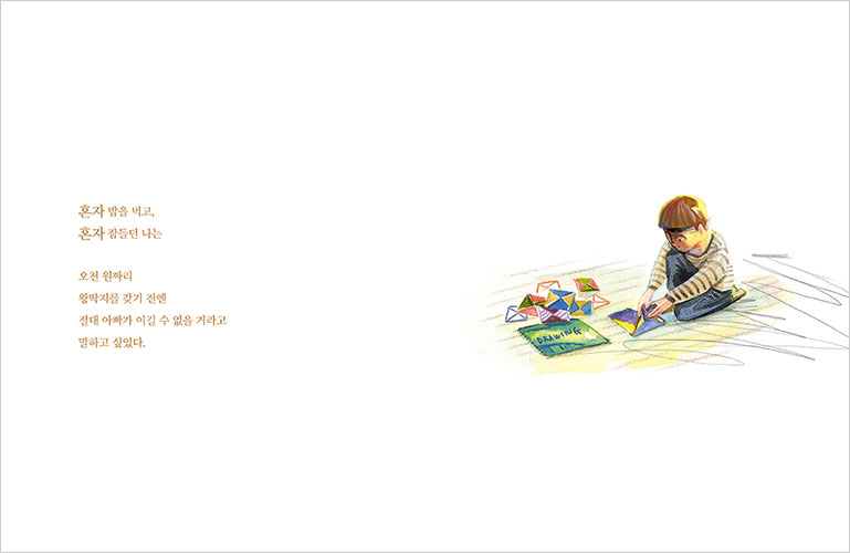 교회 건물 3층으로 이사를 왔다. 원래는 복도였던 곳에 장판을 깔고 도배를 해 마련한 방. 수도나 화장실도 없이 길쭉한 직사각형으로 생긴 방. 겨울엔 입김이 나도록 몹시 썰렁한 방… 아빠와 내가 단둘이 사는 곳이다. 초등학교 1학년 때까진 집도, 아빠의 일자리도, 엄마도 있었다. 평생 짜장면 만드는 일을 해 온 아빠가 가게를 차렸다가 망해 버리기 전까진 말이다. 지금도 이유를 잘 모르겠다. 은행, 빌린 돈, 권리금이란 게 대체 뭐기에 우리 집이 없어지고 엄마도 떠나 버린 건지…. 이런 걸 생각하고 있으면 가슴이 시리고 자꾸 눈물이 난다.