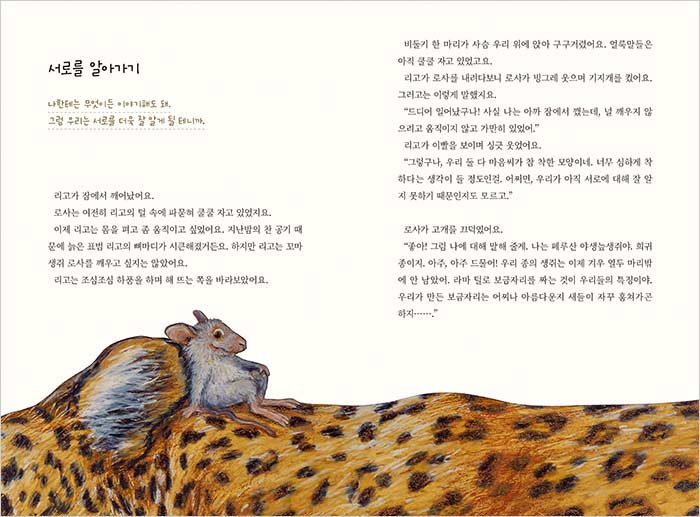 그런데 생쥐 로사의 대답이 참 재밌습니다. 나쁜 동물들이 무서워서 잠을 잘 수가 없다네요. 제 발로 표범 우리에 들어와 놓고는 말이죠. 게다가 한 술 더 떠 리고에게 자기를 좀 지켜 달라고 부탁까지 합니다. 리고는 조금 당황스럽긴 하지만 천진난만한 꼬마 생쥐의 당돌한 부탁을 거절하지 못하고 꼬리를 휘감아 로사를 덮어 주고 자장가를 불러 줍니다. 리고와 로사는 과연 아무 일 없이 하룻밤을 보낼 수 있을까요? 늙은 표범 리고와 꼬마 생쥐 로사의 조금은 위험해 보이는 특별한 만남이 시작됩니다.