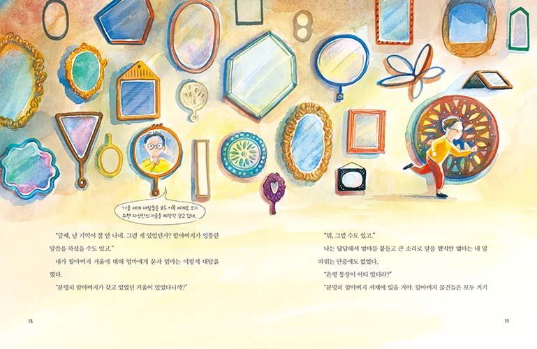 The first topic of the ‘Moving Thoughts’ series is ‘Mirror’. The main character, Jinyi, often hears stories about the world behind the mirror from his grandfather, who used to be a scientist but is now an old man suffering from dementia. One day, his grandfather asks him to find his lost mirror. While searching for it, Jinyi comes across a number of mirrors found in literature, history, and cultures, and helearns about the properties and production process of making a mirror, as well as reflection by the mirror, what is a mirror image, mirror letters, mirror perspective and distortion. He also learns the meaning and philosophy hidden in a mirror during his adventure.