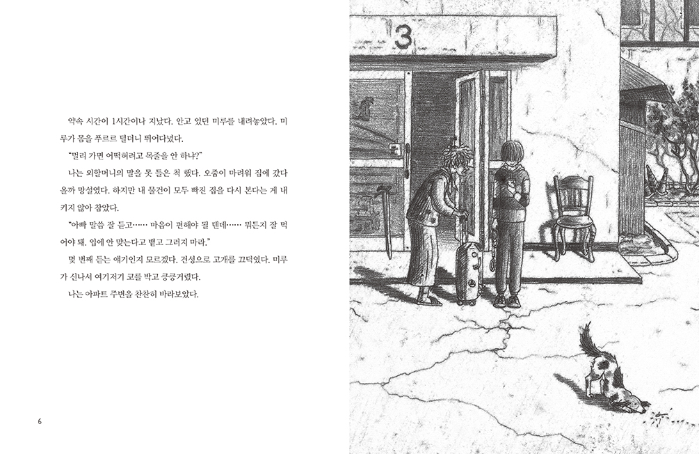 오랜만에 만난 아빠는 예전보다 뚱뚱했고 검지 한 마디가 없었다. 아빠 트럭을 타고 아빠와 살 집으로 출발한다. 나와 함께 자란 강아지 미루도 같이 간다. 그런데 아빠는 미루가 거슬리는 것 같았다. 내가 아무 말도 하지 않는 것도 마찬가지인 것 같았다. 그런데 나도 아빠의 짧아진 검지가 자꾸 신경 쓰인다. 나는 낯선 아빠와 함께 집으로 간다.